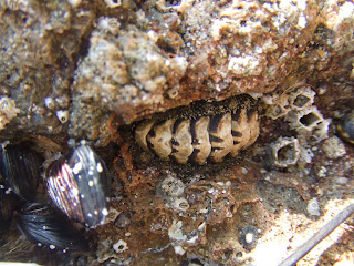 Chitons are mollusks with eight overlapping shells (count them), more closely related to mussels and clams than to barnacles.