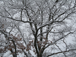 Wet, soft snow sticks to the branches of trees and coats them until the temperature rises and the snow melts and softly falls to the ground.
